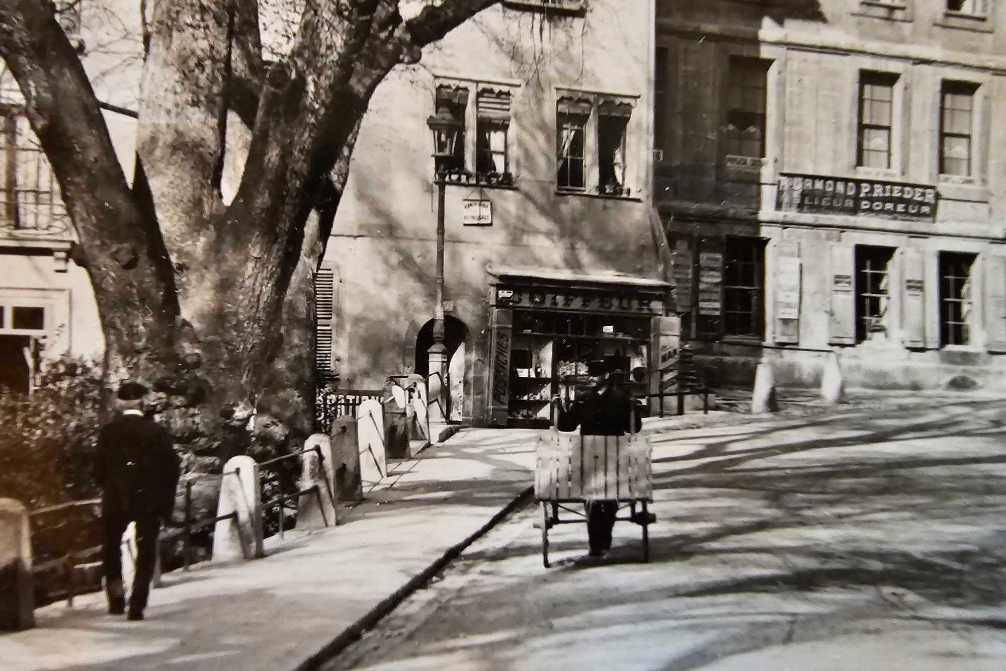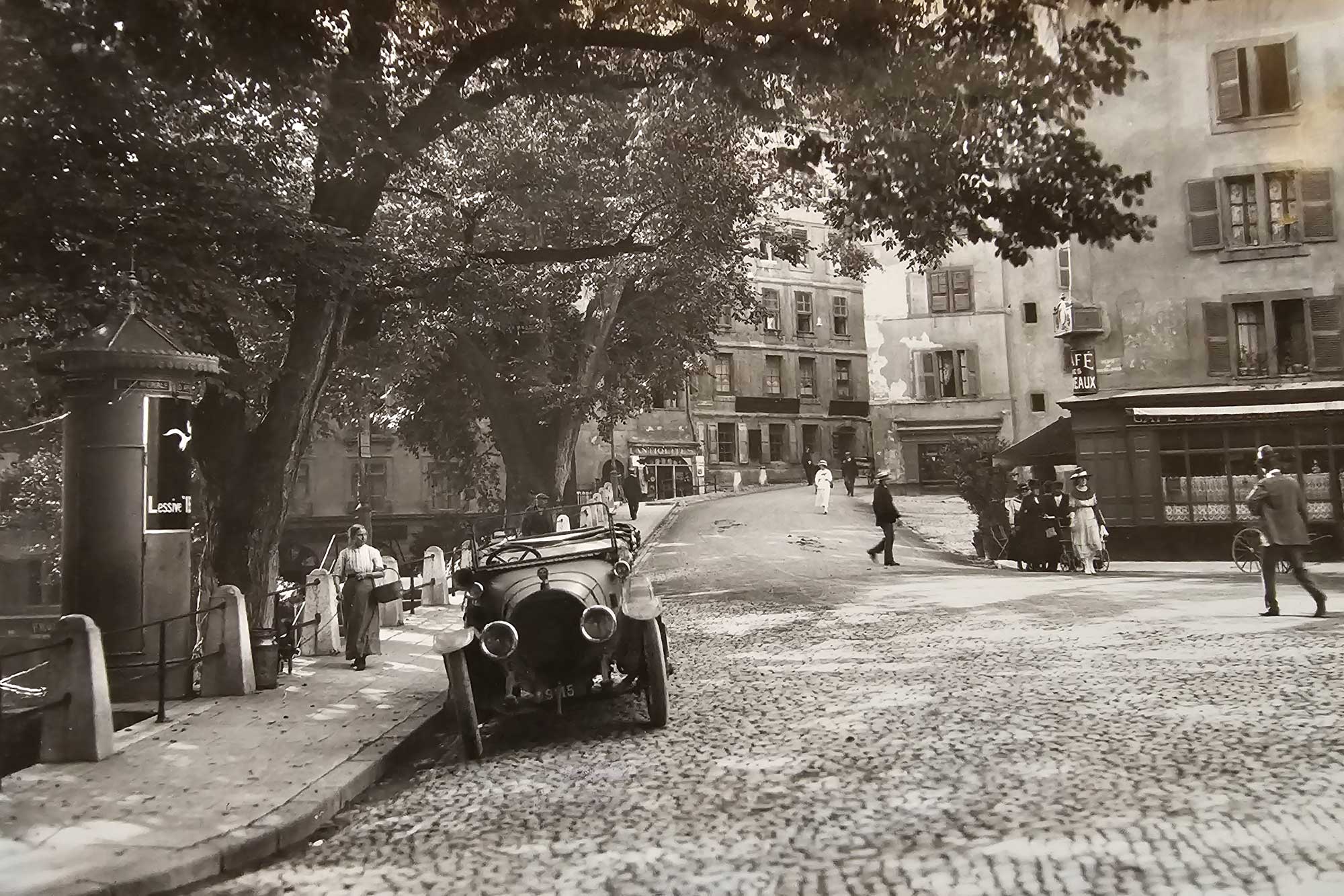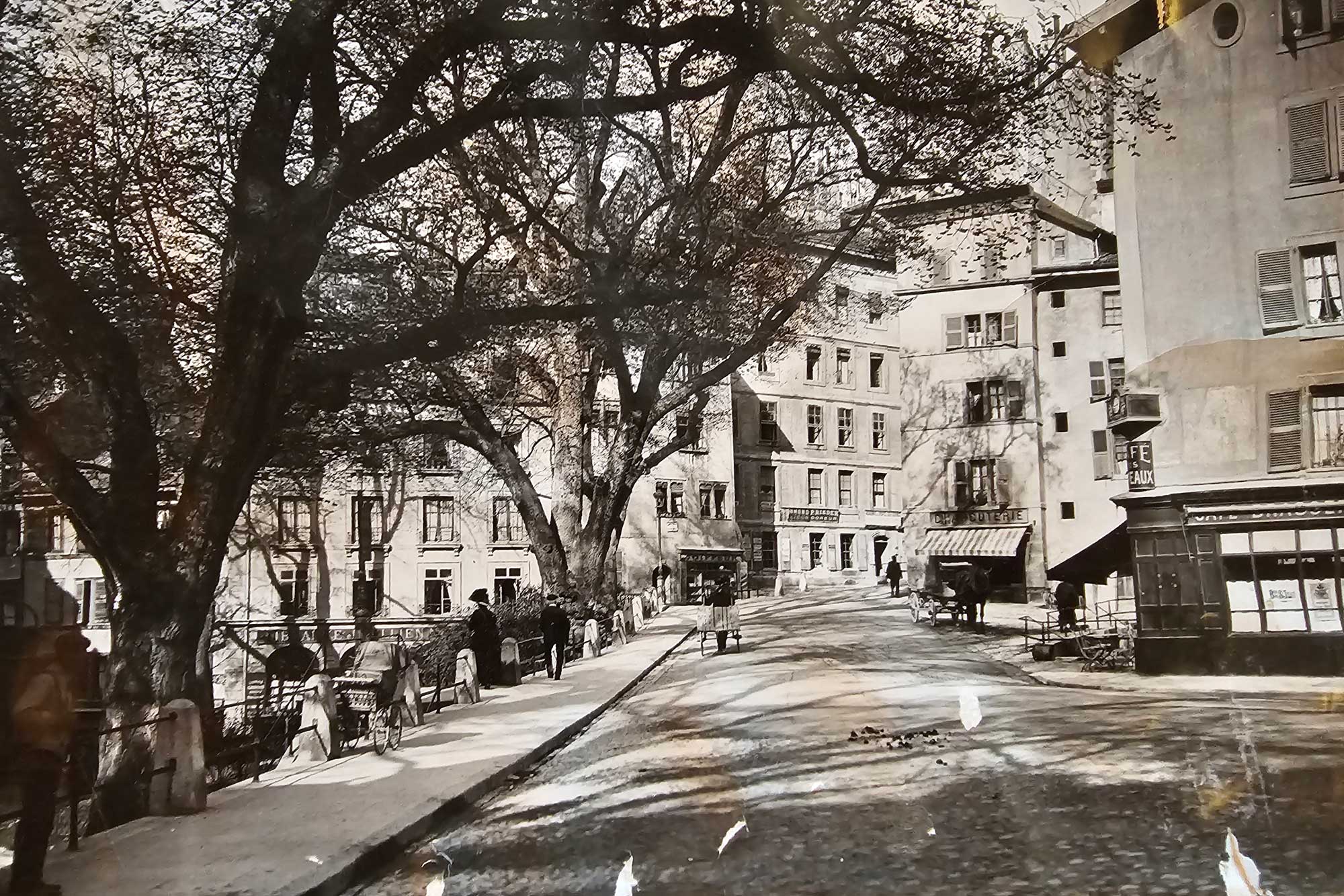 Situé à l’emplacement historique du château du Bourg-de-Four, datant du XIe siècle et ancienne forteresse des premiers Comtes de Genève, le lieu a connu de nombreuses transformations au fil du temps. Après avoir été le théâtre d’activités artisanales, il s’est peu à peu tourné vers les métiers de bouche. Dans les années 1960, il devient un restaurant prisé, refuge convivial de détente et de musique pour les collégiens du Collège Calvin.